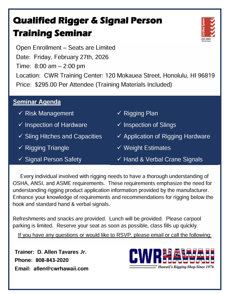 Featuring a Crosby rigging training seminar, shrimp boil lunch, and hands-on demos. Register online at kitocrosby.com/cwr Registration is required (Space is limited). This event is presented by Kito Crosby and CWR Hawaii at no charge to attendees.